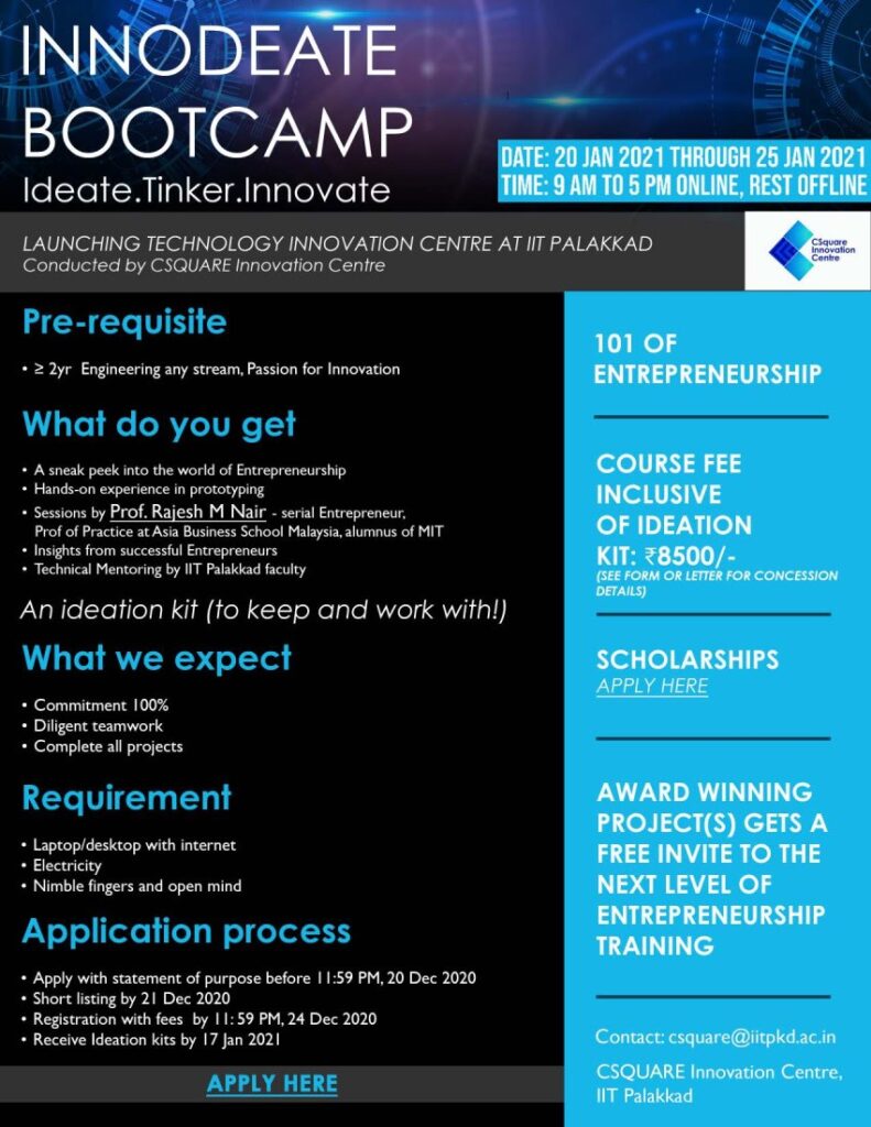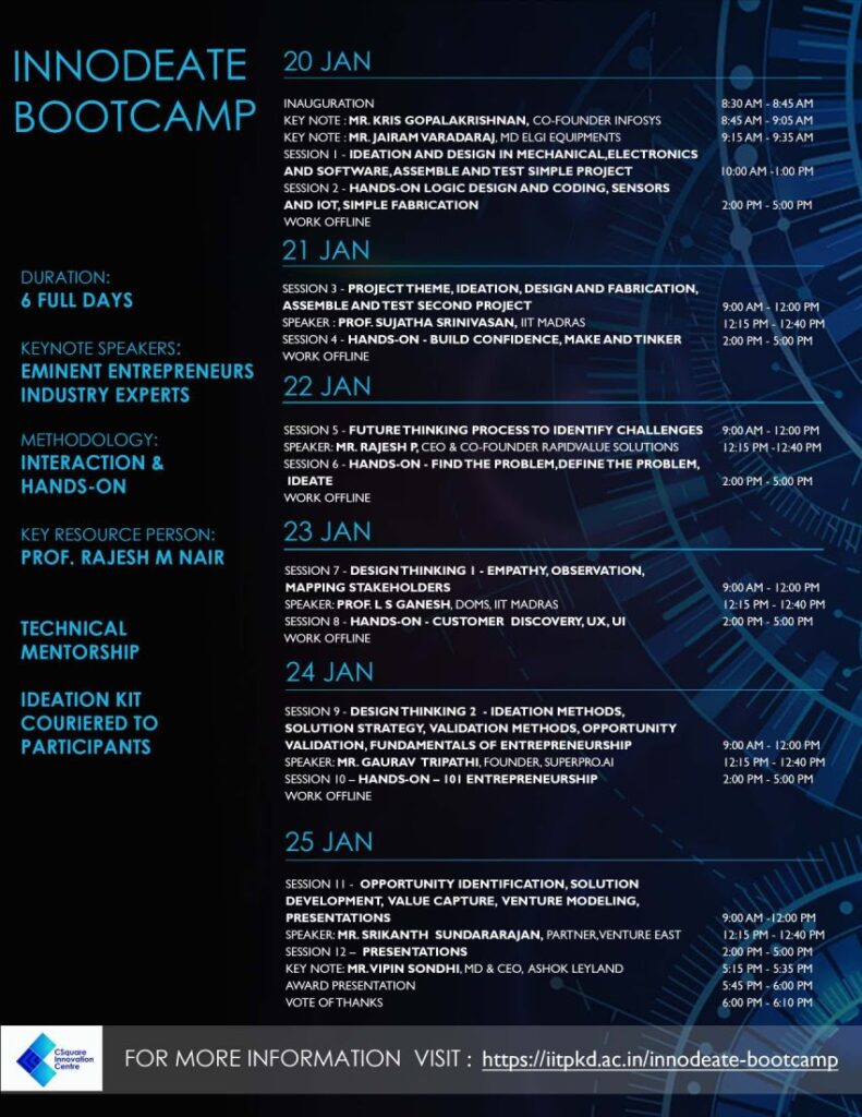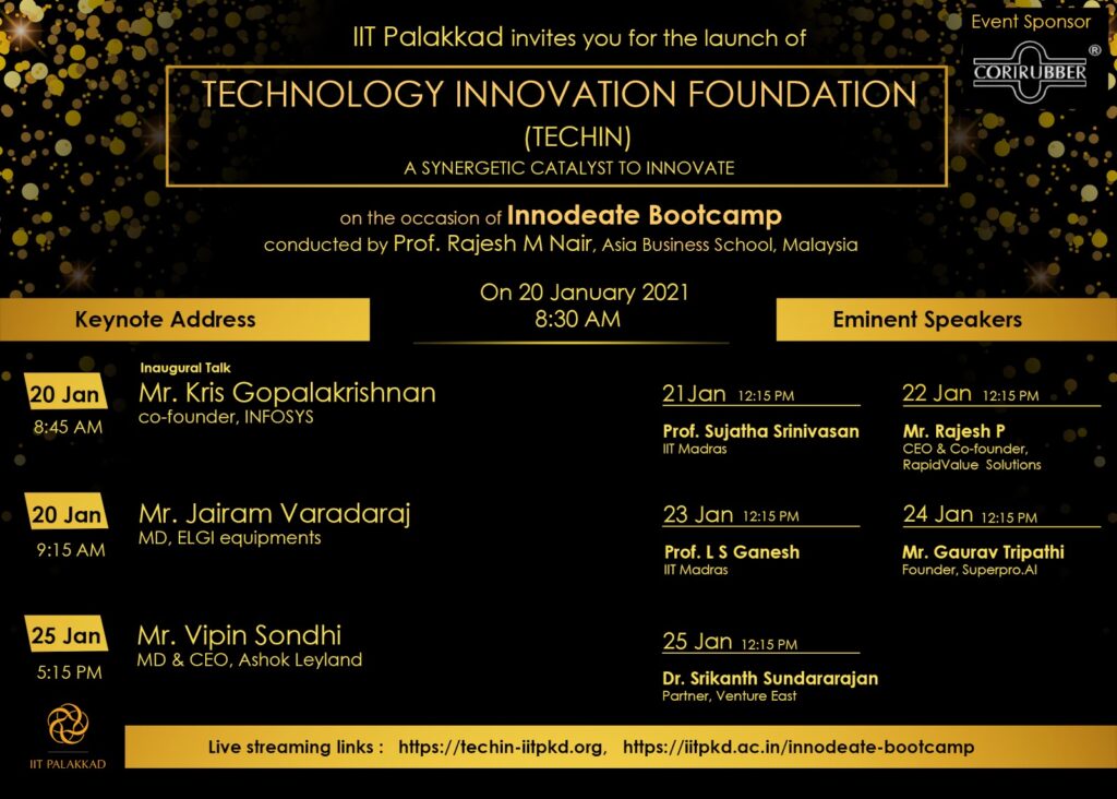 We are launching the Technology Innovation Foundation of IIT Palakkad (TECHIN) on 20th January 2021. The inaugural address is by Mr. Kris Gopalakrishnan (Co-founder INFOSYS) and keynote talks by Mr. Jairam Varadaraj (MD, ELGI Equipments) and Mr. Vipin Sondhi (MD & CEO, Ashok Leyland). A series of talks are being organised alongside. The whole event is open to all.